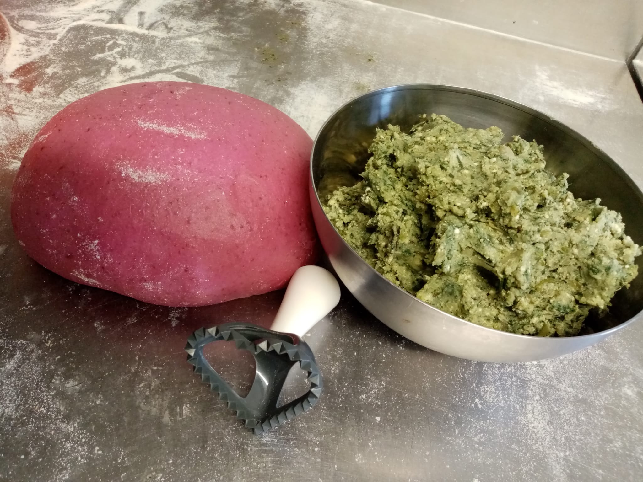 Prendete quindi la vostra pasta all'uovo rossa e tiratela fino a ottenere una sfoglia sottile. Sistemate sulla sfoglia delle palline di ripieno ad adeguata distanza l'una dall'altra e ricoprite il tutto con un'altra sfoglia. Ricavate infine i cuori con l'aiuto di uno stampino.